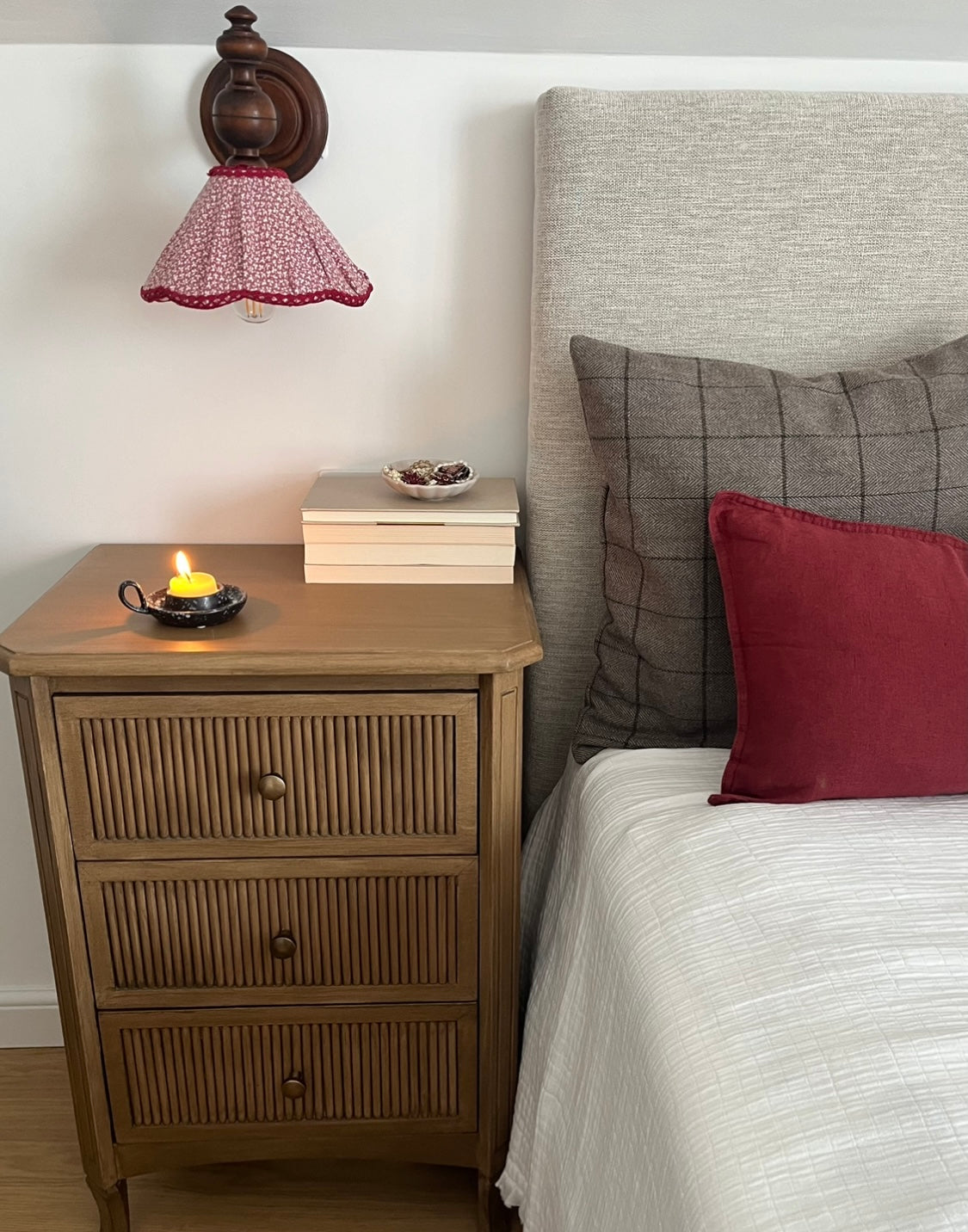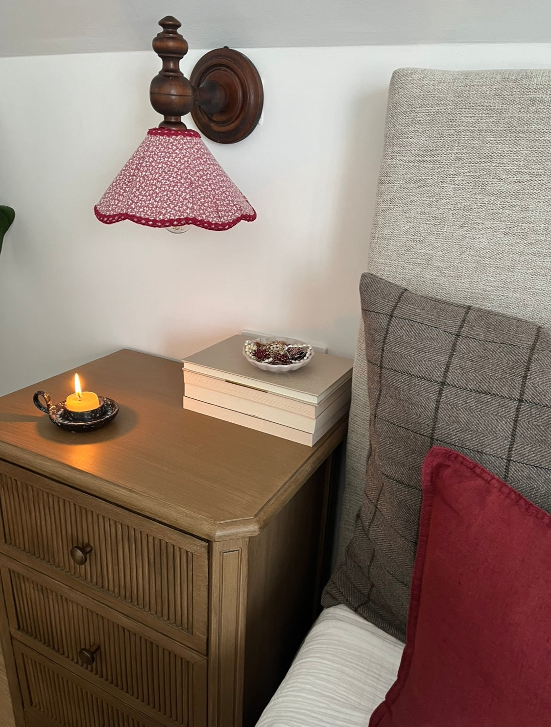 Burgundy Bloom to niewielki, ręcznie szyty abażur w kwiatowy wzór, zestawiony z oryginalnym, drewnianym kinkietem vintage, który został wyszukany specjalnie do tego projektu.