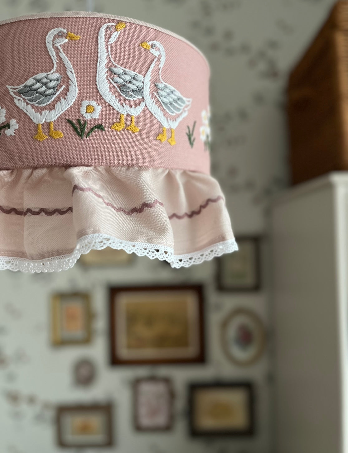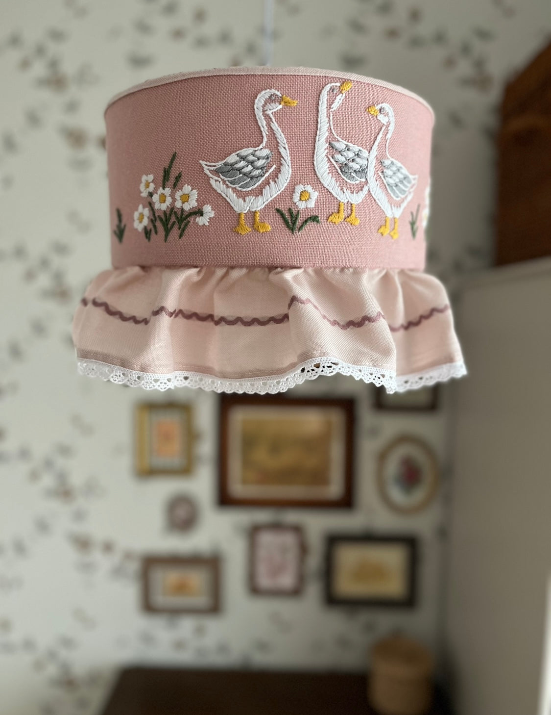 Delikatny abażur w stylu vintage, uszyty ręcznie w pracowni Lisane Atelier.